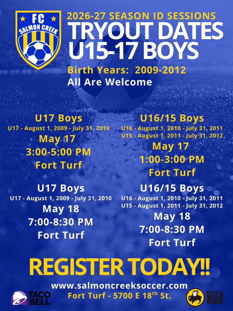 Salmon Creek is dedicated to providing young soccer players with a supportive developmental environment and a constructive athletic program. Our goal is to help build self-confidence at all competitive levels while fostering an understanding of the importance of cooperation, teamwork, and fair play. FC Salmon Creek offers participants the chance to learn valuable life lessons, forge lasting friendships, and recognize the benefits of setting and working toward common goals.
